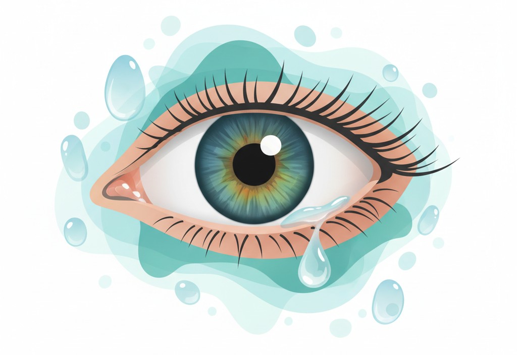 Close-up illustration of a healthy eye with a tear, surrounded by blue-green water droplets, promoting dry eyes relief.